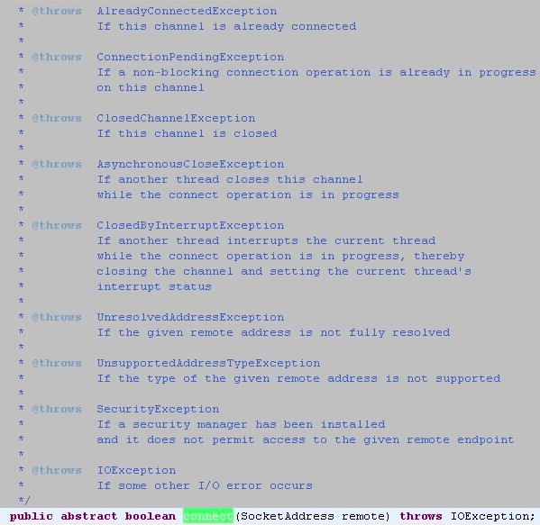 下面我们首先看下 JDK NIO 类库的 SocketChannel 连接接口定义:
