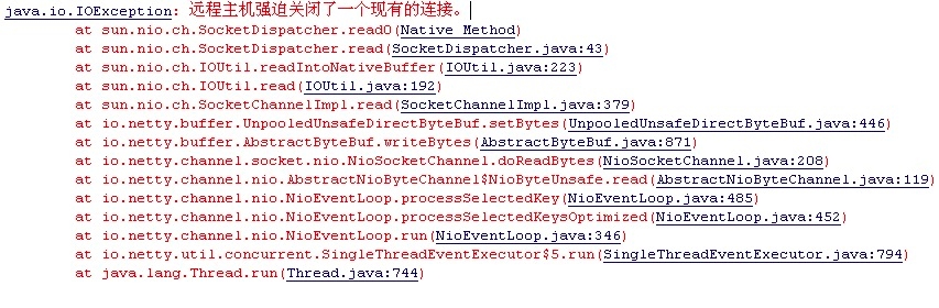 强制关闭客户端,模拟客户端宕机,服务端控制台打印如下异常: