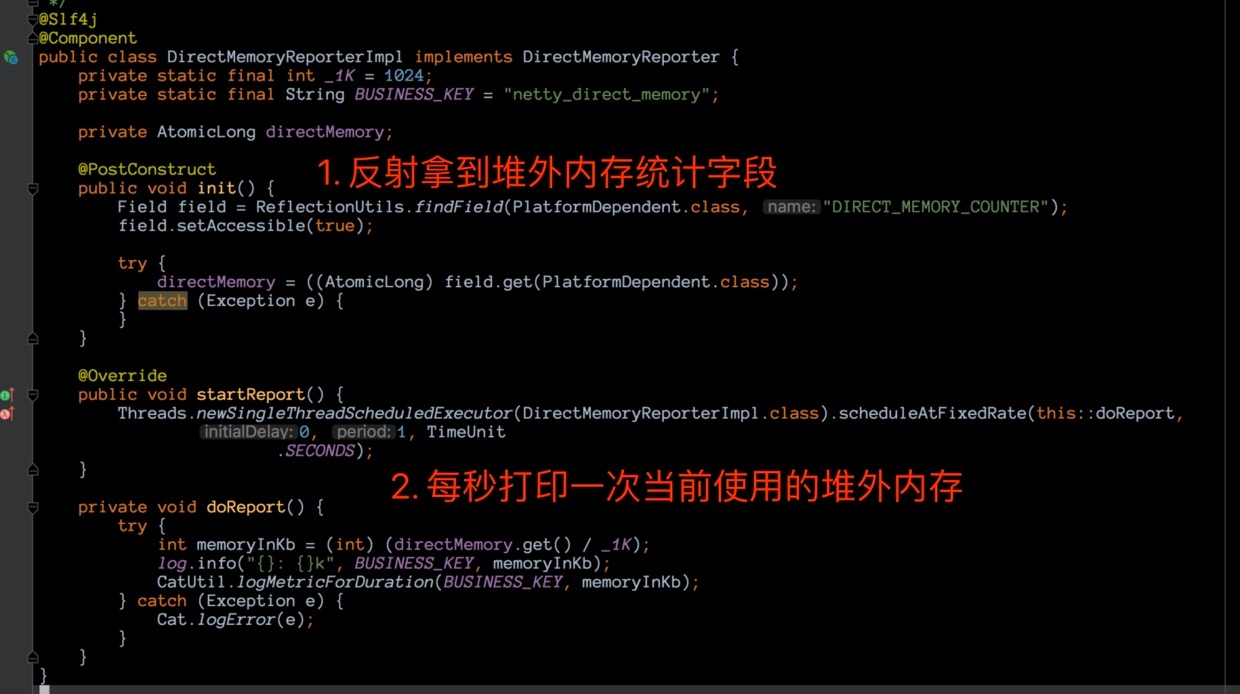 CAT 上关于堆外内存的监控没有任何异常(应该是没有统计准确,一直维持在 1M),而这边我们又确认堆外内存已快超过上限,并且已经知道 Netty 底层是使用的哪个字段来统计。那么接下来要做的第一件事情,就是反射拿到这个字段,然后我们自己统计 Netty 使用堆外内存的情况。