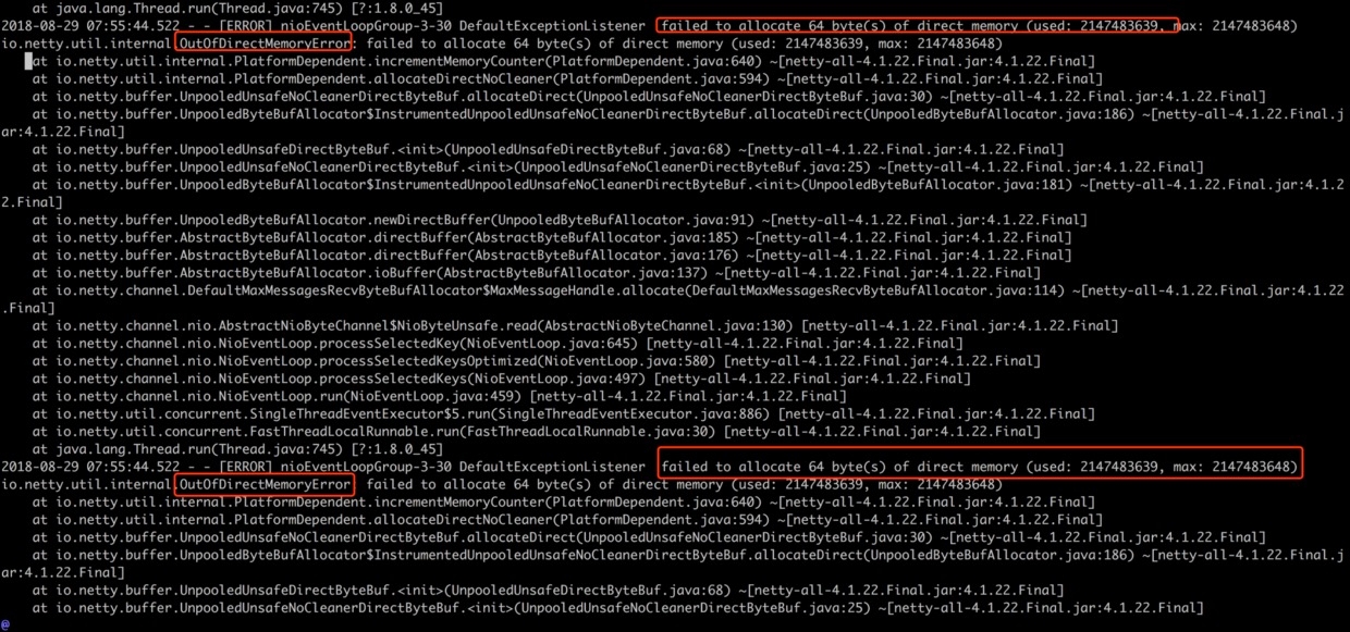 可以看到:在极短的时间内,狂打 failed to allocate 64(bytes) of direct memory(...)日志(瞬间十几个日志文件,每个日志文件几百M),日志里抛出一个 Netty 自己封装的OutOfDirectMemoryError。说白了,就是堆外内存不够用,Netty 一直在“喊冤”。