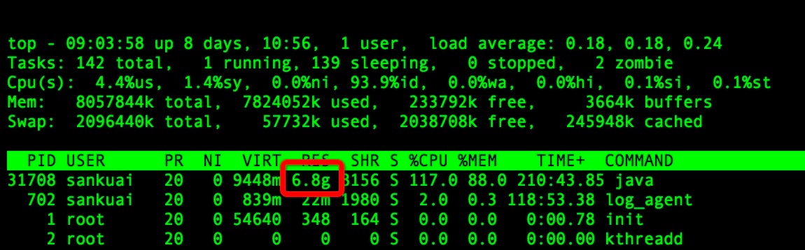 为了更好地实现对项目的管理,我们将组内一个项目迁移到MDP框架(基于Spring Boot),随后我们就发现系统会频繁报出Swap区域使用量过高的异常。笔者被叫去帮忙查看原因,发现配置了4G堆内内存,但是实际使用的物理内存竟然高达7G,确实不正常。JVM参数配置是“-XX:MetaspaceSize=256M -XX:MaxMetaspaceSize=256M -XX:+AlwaysPreTouch -XX:ReservedCodeCacheSize=128m -XX:InitialCodeCacheSize=128m, -Xss512k -Xmx4g -Xms4g,-XX:+UseG1GC -XX:G1HeapRegionSize=4M”,实际使用的物理内存如下图所示: