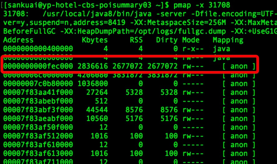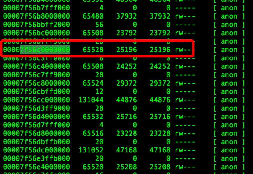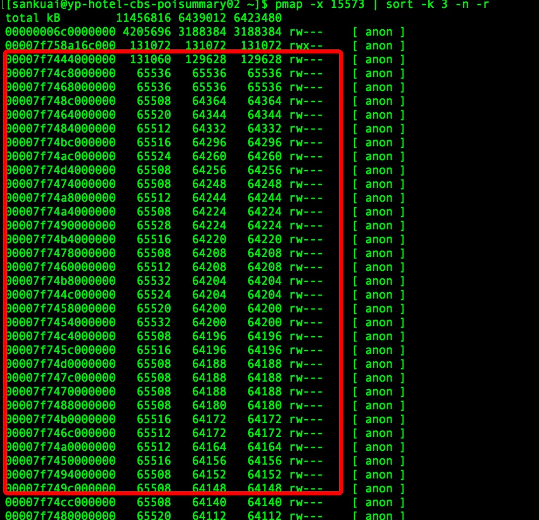 为了防止误判,笔者使用了pmap查看内存分布,发现大量的64M的地址;而这些地址空间不在jcmd命令所给出的地址空间里面,基本上就断定就是这些64M的内存所导致。