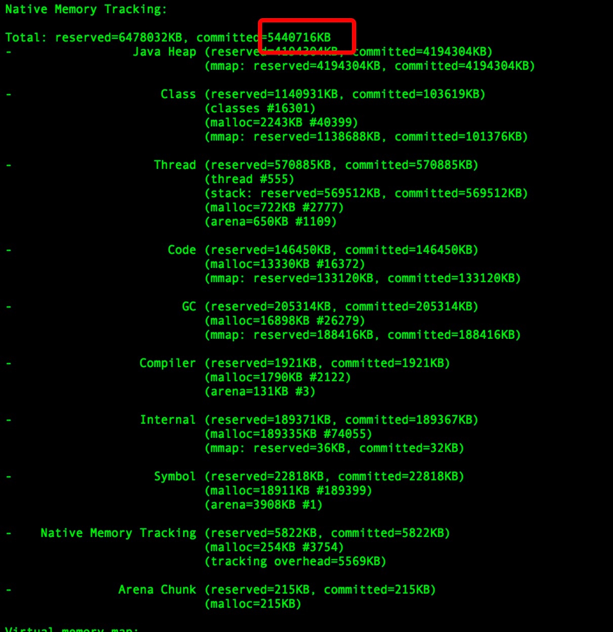 发现命令显示的committed的内存小于物理内存,因为jcmd命令显示的内存包含堆内内存、Code区域、通过unsafe.allocateMemory和DirectByteBuffer申请的内存,但是不包含其他Native Code(C代码)申请的堆外内存。所以猜测是使用Native Code申请内存所导致的问题。