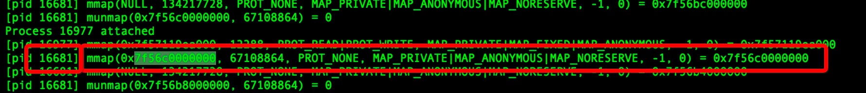 项目启动使用strace追踪系统调用,发现确实申请了很多64M的内存空间,截图如下: