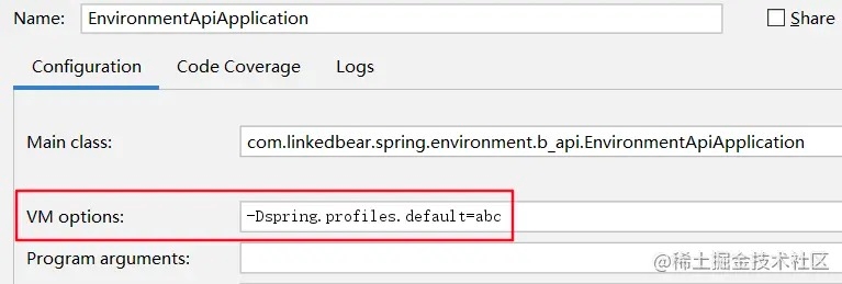 上面的源码中,也可以看到,我们可以通过声明 **spring.profiles.default** 的配置,来覆盖 SpringFramework 中原有的默认 profiles ,一个比较常用的方法是在 jvm 的启动参数上添加: