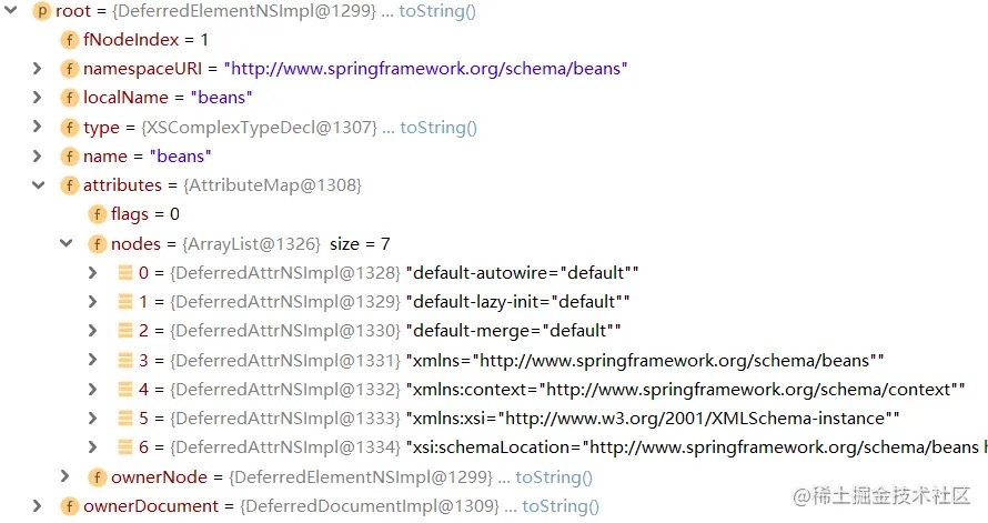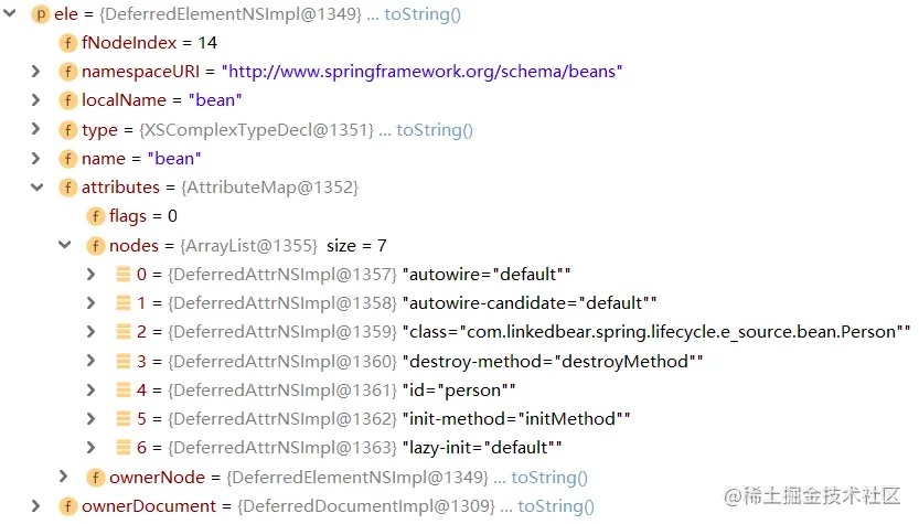 Debug 至此,可以发现,这个 Element 中已经包含了一个 <bean> 标签中定义的那些属性了: