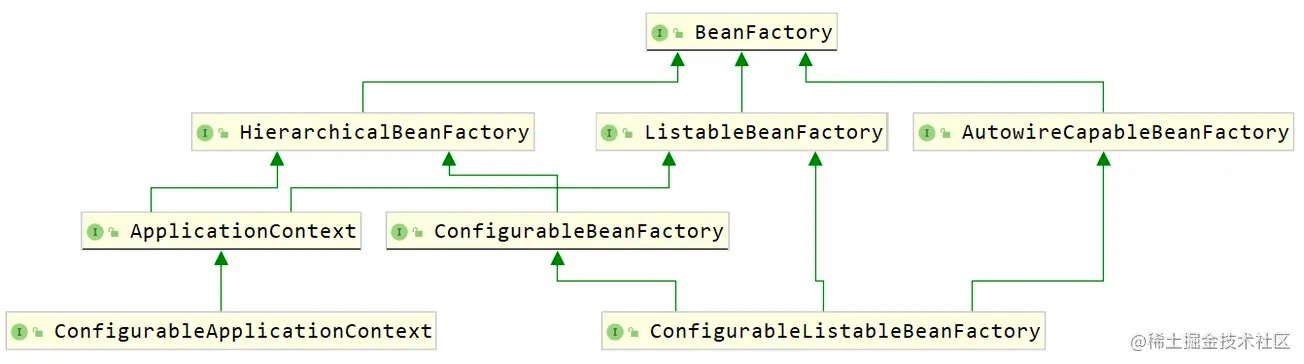 回想一开始学习面向对象编程时,就知道一个类的属性设置为 private 后,提供 get 方法则意味着该属性可读,提供 set 方法则意味着该属性可写。同样的,在 SpringFramework 的这些 BeanFactory ,包括后面的 ApplicationContext 中,都会有这样的设计。普通的 BeanFactory 只有 get 相关的操作,而 Configurable 开头的 BeanFactory 或者 ApplicationContext 就具有了 set 的操作。