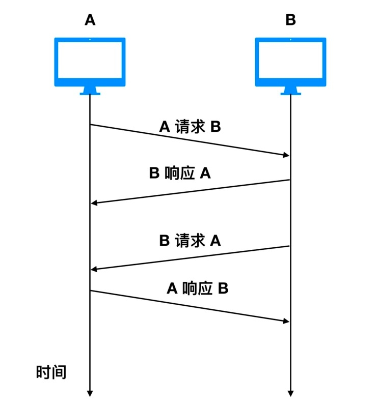 如图所示,A 和 B 是两个不同的端系统,它们之间可以作为信息交换的载体存在,刚开始的时候是 A 作为请求方请求与 B 交换信息,B 作为响应的一方提供信息;随着时间的推移,B 也可以作为请求方请求 A 交换信息,那么 A 也可以作为响应方响应 B 请求的信息。