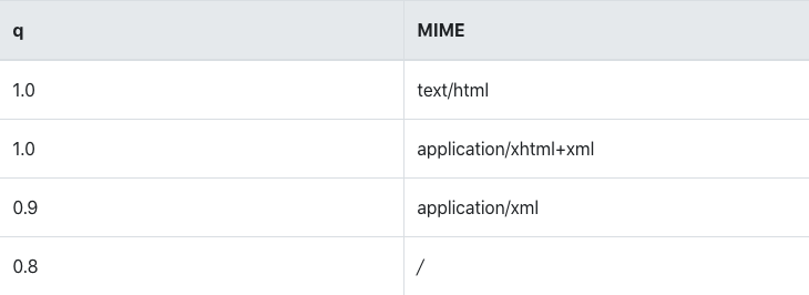 一般 MIME 类型也会和 q 这个属性一起使用,q 是什么?q 表示的是权重,来看一个例子: