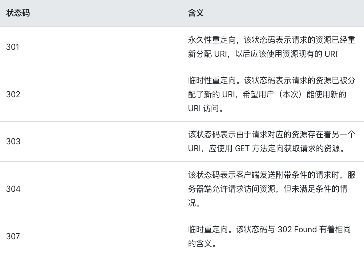 以 3xx 为开头的都表示需要进行附加操作以完成请求: