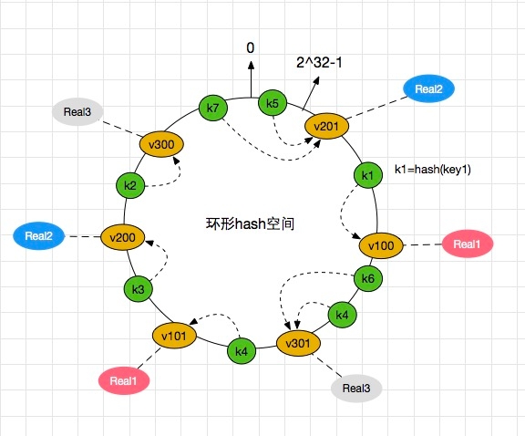 “虚拟节点”( virtual node )是实际节点(机器)在 hash 空间的复制品( replica ),一实际个节点(机器)对应了若干个“虚拟节点”,这个对应个数也成为“复制个数”,“虚拟节点”在 hash 空间中以hash值排列。