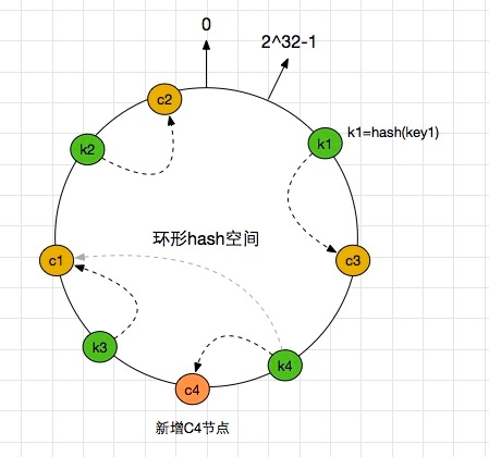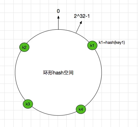 假设我们现在有key1,key2,key3,key4 4个key值,我们通过一定的hash算法,将其对应到上面的环形hash空间中。