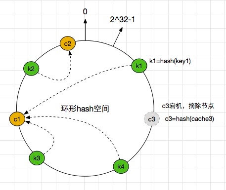 假设cache3服务器宕机,这时候需要从集群中将其摘除。那么,之前存储再c3上的k1,将会顺时针寻找距离它最近的一个节点,也就是c1节点,这样,k1就会存储到c1上了,看一看下下面的图,比较清晰。