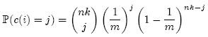 我们先计算第i个Counter被增加j次的概率,其中n为集合元素个数,k为哈希函数个数,m为Counter个数(对应着原来位数组的大小):