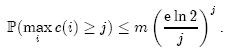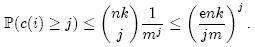 上面等式右端的表达式中,前一部分表示从nk次哈希中选择j次,中间部分表示j次哈希都选中了第i个Counter,后一部分表示其它nk – j次哈希都没有选中第i个Counter。因此,第i个Counter的值大于j的概率可以限定为: