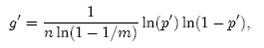 需要强调的一点是,p = 1/2时错误率最小这个结果并不依赖于近似值p和f。同样对于f’ = exp(k ln(1 − (1 − 1/m)kn)),g’ = k ln(1 − (1 − 1/m)kn),p’ = (1 − 1/m)kn,我们可以将g’写成: