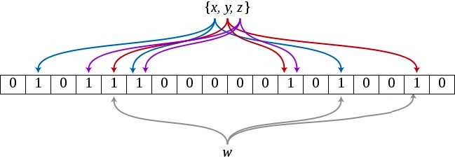 在上图中,当插入x、y、z这三个元素之后,再来查询w,会发现w不在集合之中,而如果w经过三个hash函数计算得出的结果所得索引处的位全是1,那么Bloom Filter就会告诉你,w在集合之中,实际上这里是误报,w并不在集合之中。