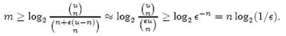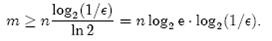 上式中的近似前提是n和єu相比很小,这也是实际情况中常常发生的。根据上式,我们得出结论: 在错误率不大于є的情况下,m至少要等于n log2(1/є)才能表示任意n个元素的集合。