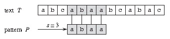 比如上图中,目标是找出所有在文本 T = abcabaabcabac 中模式 P = abaa 的所有出现。该模式在此文本中仅出现一次,即在位移 s = 3 处,位移 s = 3 是有效位移。