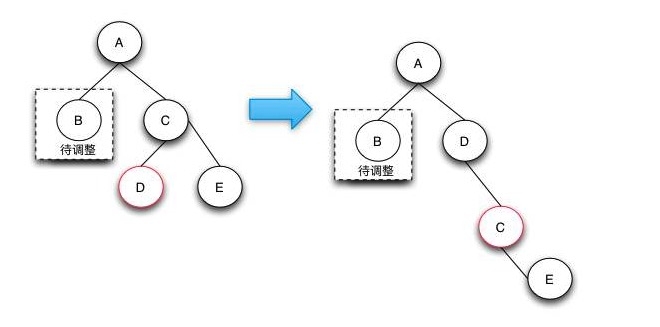 由于兄弟节点是红色节点的时候,无法借调黑节点,所以需要将兄弟节点提升到父节点,由于兄弟节点是红色的,根据RBTree的定义,兄弟节点的子节点是黑色的,就可以从它的子节点借调了。