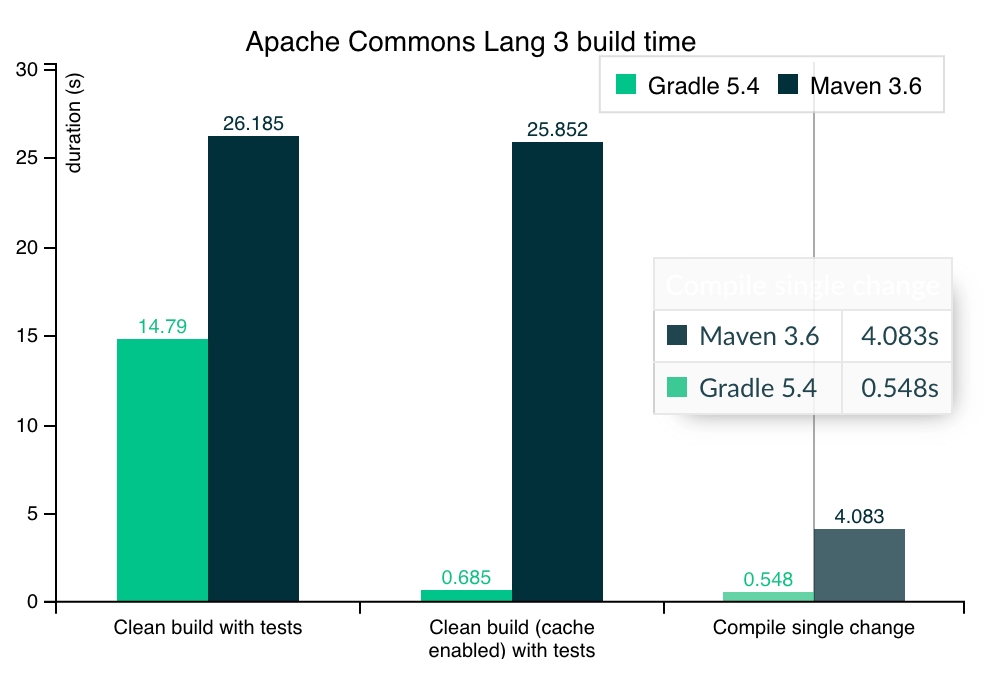 This GIF shows a side-by-side clean build of the Apache Commons Lang library using Maven and Gradle (without build cache). You can view the build scan for this build here.