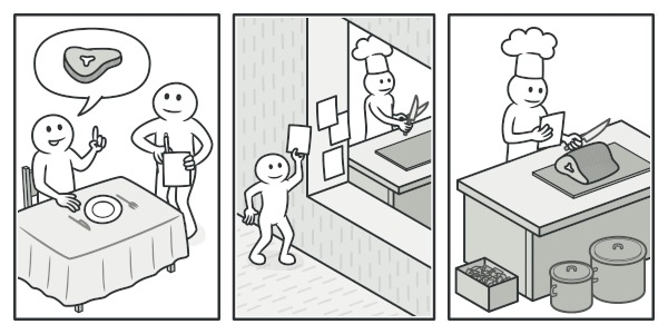 在市中心逛了很久的街后, 你找到了一家不错的餐厅, 坐在了临窗的座位上。 一名友善的服务员走近你, 迅速记下你点的食物, 写在一张纸上。 服务员来到厨房, 把订单贴在墙上。 过了一段时间, 厨师拿到了订单, 他根据订单来准备食物。 厨师将做好的食物和订单一起放在托盘上。 服务员看到托盘后对订单进行检查, 确保所有食物都是你要的, 然后将食物放到了你的桌上。