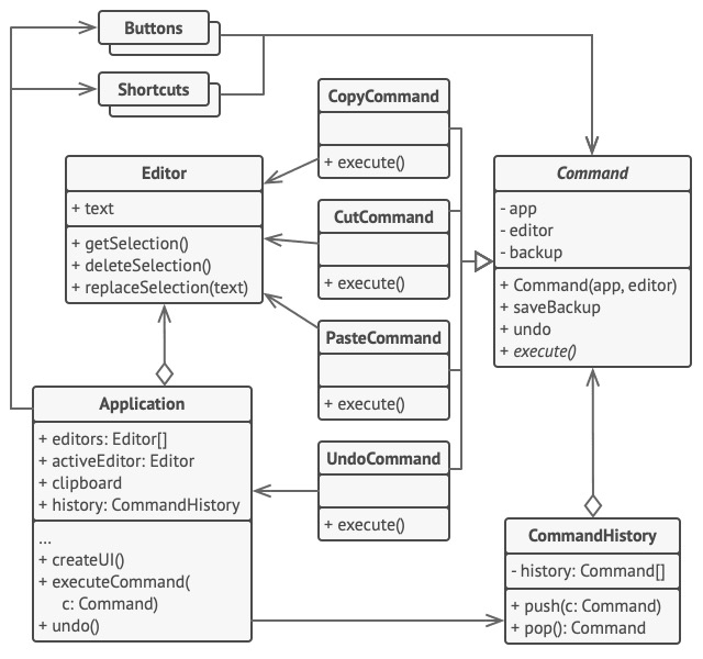 有些命令会改变编辑器的状态 (例如剪切和粘贴), 它们可在执行相关操作前对编辑器的状态进行备份。 命令执行后会和当前点备份的编辑器状态一起被放入命令历史 (命令对象栈)。 此后, 如果用户需要进行回滚操作, 程序可从历史记录中取出最近的命令, 读取相应的编辑器状态备份, 然后进行恢复。