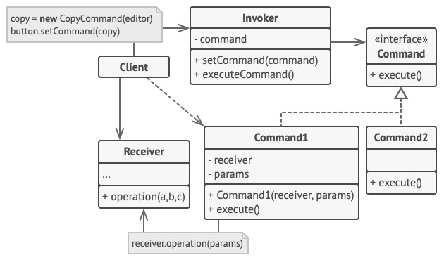 接收对象执行方法所需的参数可以声明为具体命令的成员变量。 你可以将命令对象设为不可变, 仅允许通过构造函数对这些成员变量进行初始化。