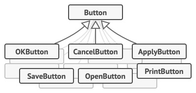 你很快就意识到这种方式有严重缺陷。 首先, 你创建了大量的子类, 当每次修改基类 按钮时, 你都有可能需要修改所有子类的代码。 简单来说, GUI 代码以一种拙劣的方式依赖于业务逻辑中的不稳定代码。