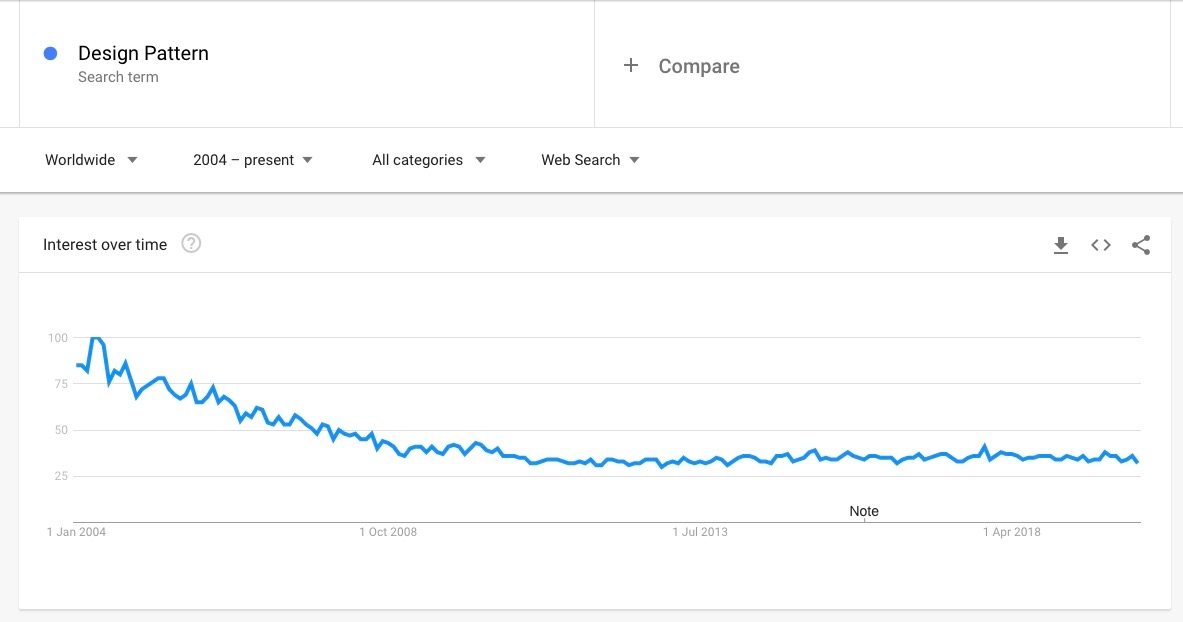 很多工程师都在研究设计模式,企图让自己设计的软件变得更加优秀,一些候选人也在简历上写着自己掌握多少种设计模式并在面试时讨论书中的那 23 种设计模式。与设计模式在中国的流行相比,在全世界范围内,设计模式的热度从 2004 年开始却一直在下降3。