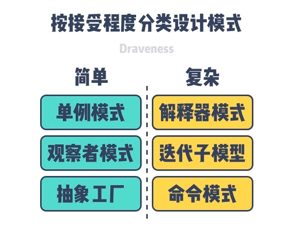这里只是一个比较简单的划分,不同人对模式难易的认知有比较大的差异,这里的核心问题是书中列举的 23 种设计模式真的是被广泛传播和认可的么。在作者看来,设计模式虽然流传的很广泛,但是并不是所有人都清楚书中每一个模式的定义和场景,这也就丧失了提高沟通效率的作用,而常见的模式也不需要通过阅读《设计模式》来学习。