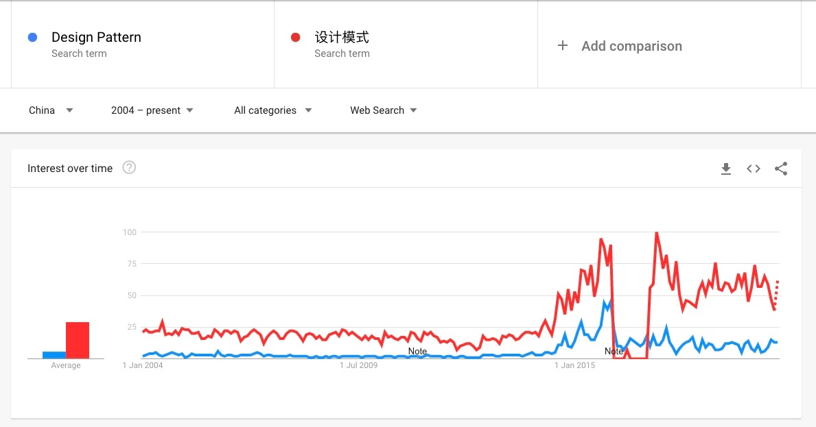中国的设计模式搜索指数 [https://trends.google.com/trends/explore?date=all&geo=CN&q=Design%20Pattern,%E8%AE%BE%E8%AE%A1%E6%A8%A1%E5%BC%8F](https://trends.google.com/trends/explore?date=all&geo=CN&q=Design Pattern,设计模式) ↩︎