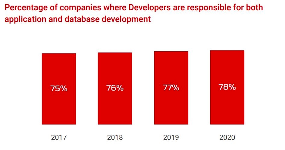 The State of Database DevOps Survey also revealed that there is a growth of developers moving into full stack development, taking on tasks for developing both the application and the database: