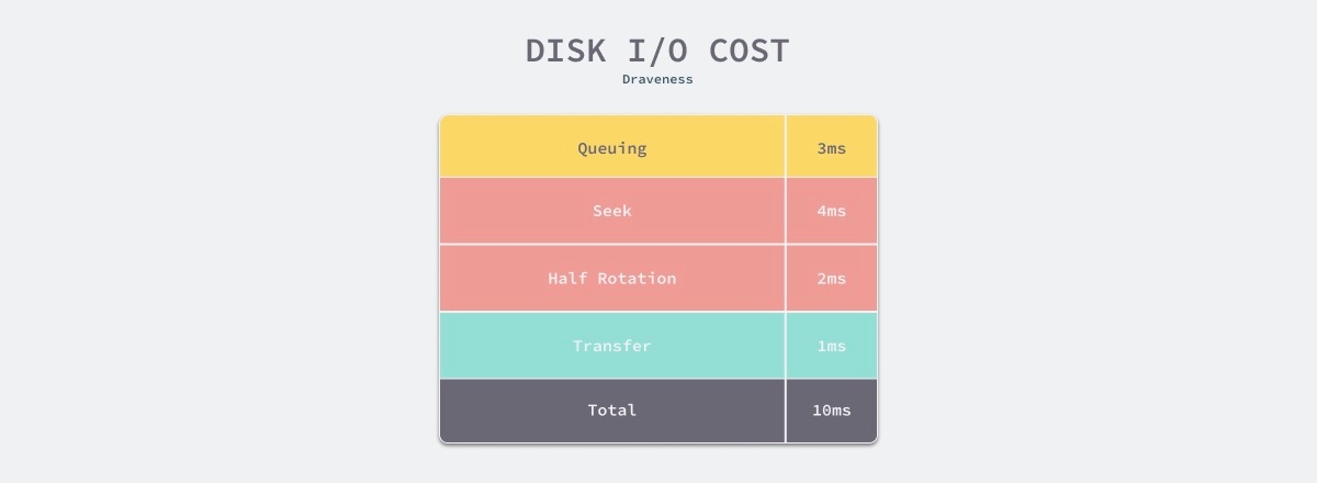 当我们需要在数据库中查询数据时,CPU 会发现当前数据位于磁盘而不是内存中,这时就会触发 I/O 操作将数据加载到内存中进行访问,数据的加载都是以页的维度进行加载的,然而将数据从磁盘读取到内存中所需要的成本是非常大的,普通磁盘(非 SSD)加载数据需要经过队列、寻道、旋转以及传输的这些过程,大概要花费 10ms 左右的时间。