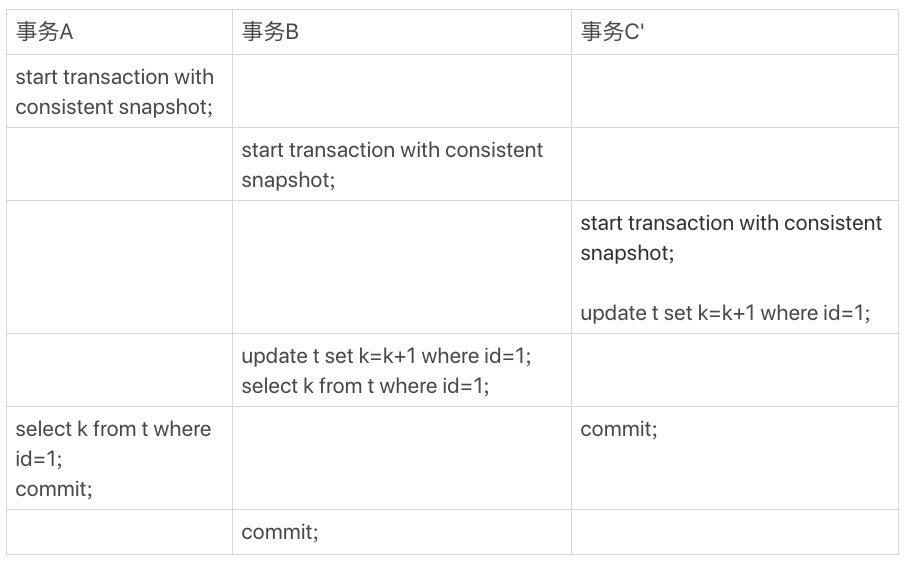 再往前一步,假设事务 C 不是马上提交的,而是变成了下面的事务 C’,会怎么样呢?
