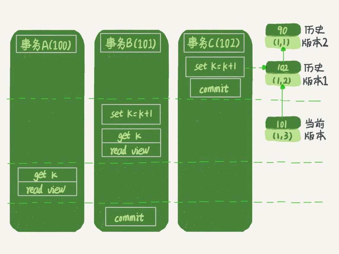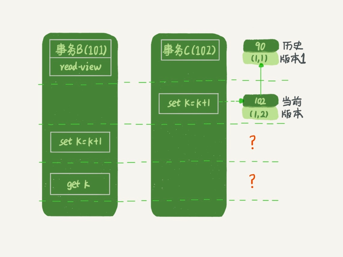所以,在执行事务 B 查询语句的时候,一看自己的版本号是 101,最新数据的版本号也是 101,是自己的更新,可以直接使用,所以查询得到的 k 的值是 3。