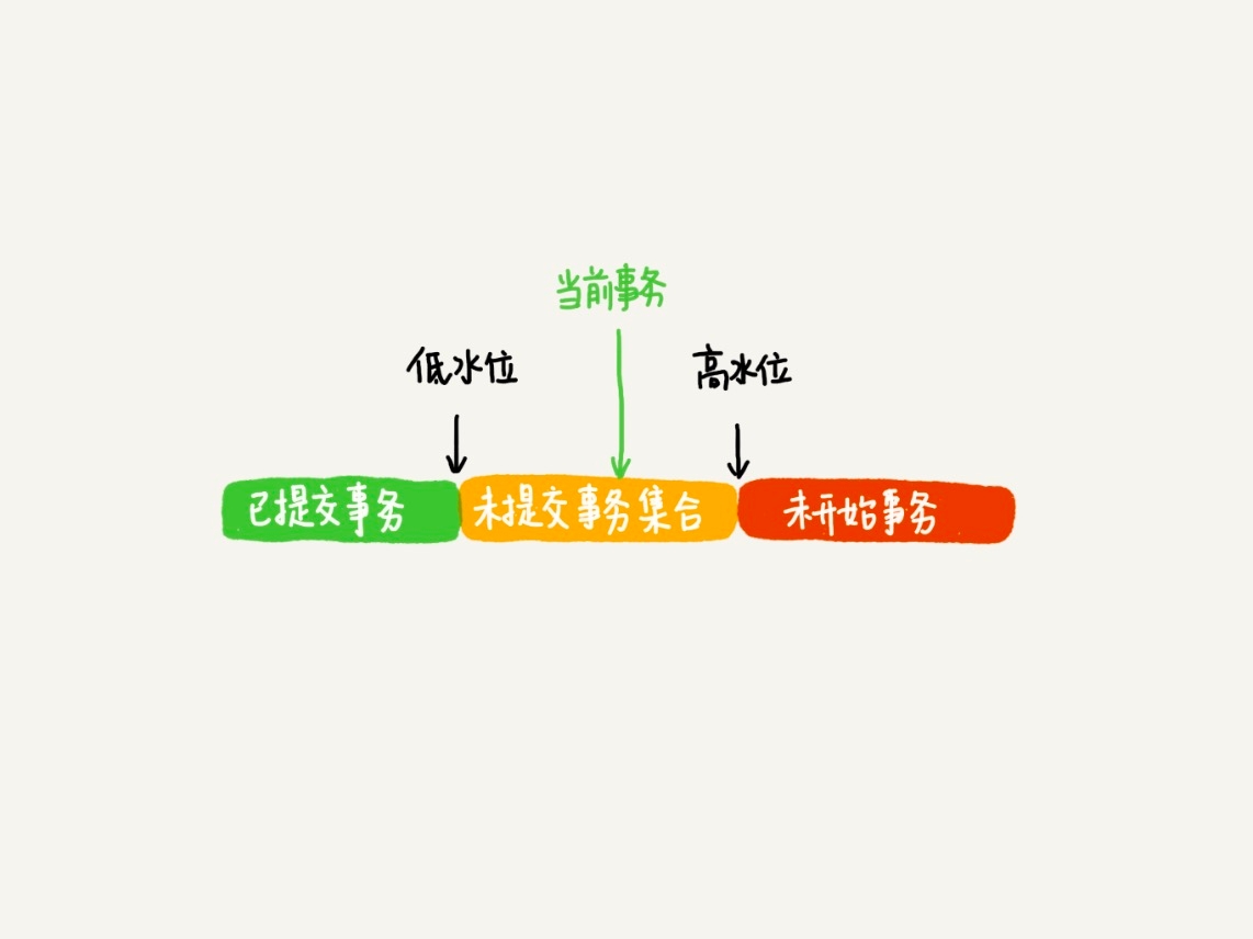 数组里面事务 ID 的最小值记为低水位,当前系统里面已经创建过的事务 ID 的最大值加 1 记为高水位。