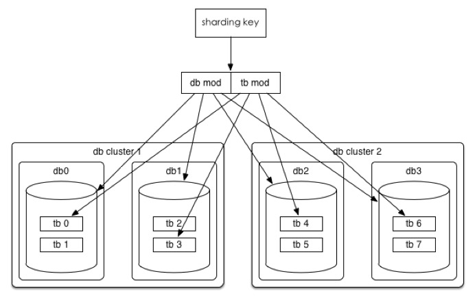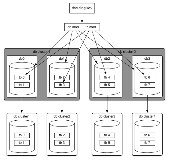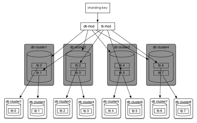以统一订单库为例,我们分库分表的方案是32*32的,即通过UserId后四位mod 32分到32个库中,同时再将UserId后四位Div 32 Mod 32将每个库分为32个表,共计分为1024张表。线上部署情况为8个集群(主从),每个集群4个库。