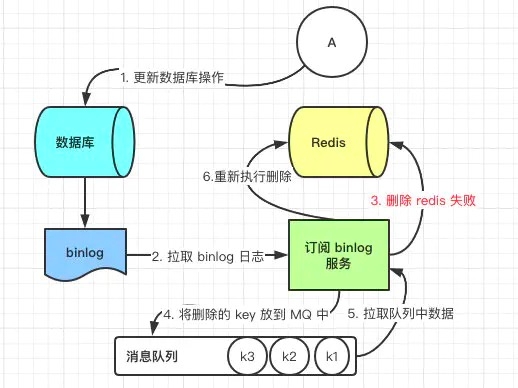 但是这个方案会有一个缺点就是会对业务代码造成大量的侵入,深深的耦合在一起,所以这时会有一个优化的方案,我们知道对 Mysql 数据库更新操作后再 binlog 日志中我们都能够找到相应的操作,那么我们可以订阅 Mysql 数据库的 binlog 日志对缓存进行操作。