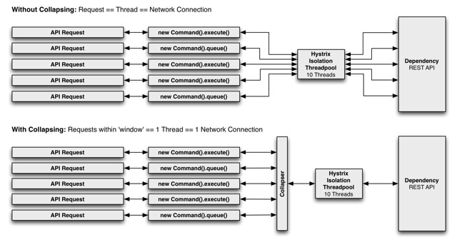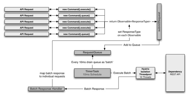For example, if you configure a HystrixCommand to support batching for any user on requests to a dependency that retrieves movie ratings, then when any user thread in the same JVM makes such a request, Hystrix will add its request along with any others into the same collapsed network call.