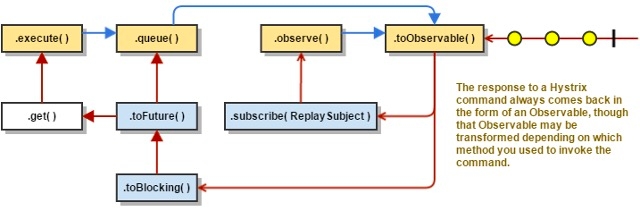 execute()— blocks, then returns the single response received from the dependency (or throws an exception in case of an error)queue()— returns aFuturewith which you can obtain the single response from the dependencyobserve()— subscribes to theObservablethat represents the response(s) from the dependency and returns anObservablethat replicates that sourceObservabletoObservable()— returns anObservablethat, when you subscribe to it, will execute the Hystrix command and emit its responses