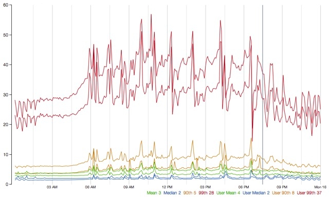 The following diagram represents one HystrixCommand being executed at 60 requests-per-second on a single API instance (of about 350 total threaded executions per second per server):