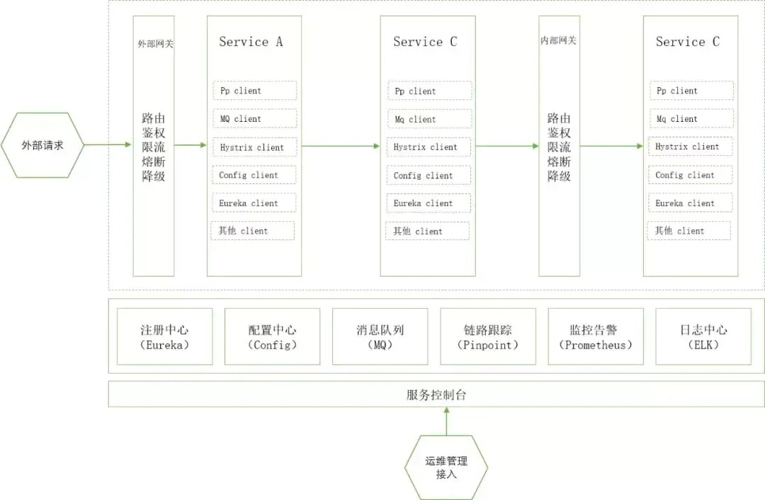 Spring Cloud架构解析的目的在于确定需要从当前的服务中去除与Service Mesh重叠的功能,为后续服务替换做准备。我们来看一个典型的Spring Cloud架构体系,如图所示: