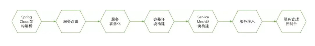 Spring Cloud向Service Mesh迁移,从我们考虑而言大体分为七个步骤,如图所示: