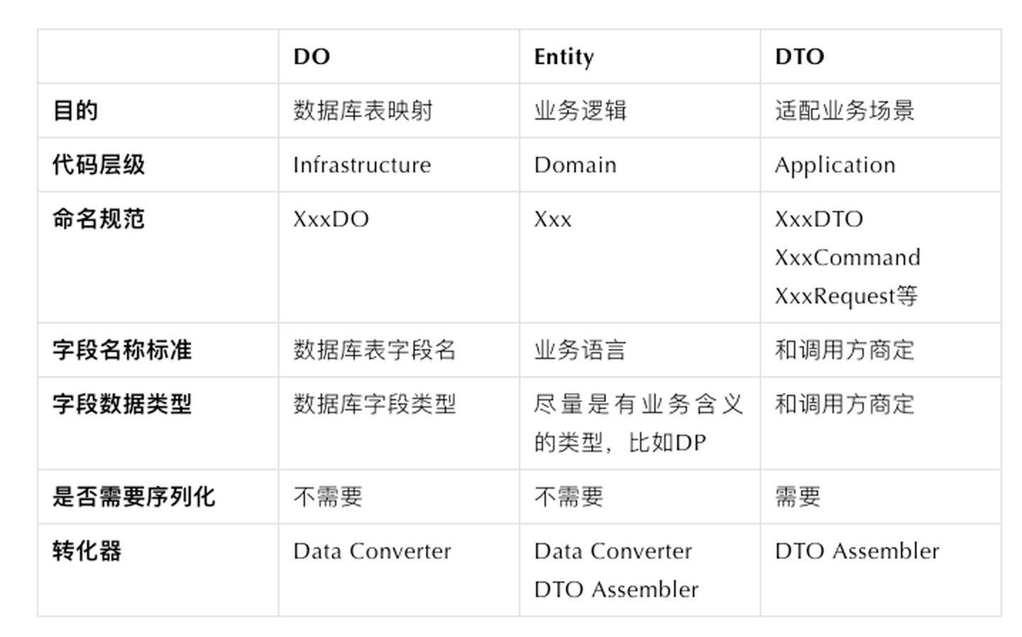 在讲Repository规范之前,我们需要先讲清楚3种模型的区别,Entity、Data Object (DO)和Data Transfer Object (DTO):
