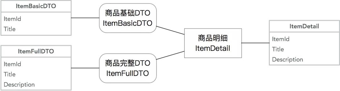 从复杂Entity里抽取部分信息形成多个DTO:这种情况通常在Entity复杂,但是调用方只需要部分核心信息的情况下,通过一个小的DTO降低信息传输成本。同样拿商品模型举例,基础DTO可能出现在商品列表里,这个时候不需要复杂详情: