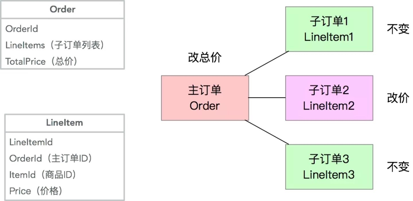 针对单一Entity的Repository实现一般比较简单,但是当涉及到多Entity的Aggregate Root时,就会比较麻烦,最主要的原因是在一次操作中,并不是所有Aggregate里的Entity都需要变更,但是如果用简单的写法,会导致大量的无用DB操作。举一个常见的例子,在主子订单的场景下,一个主订单Order会包含多个子订单LineItem,假设有个改某个子订单价格的操作,会同时改变主订单价格,但是对其他子订单无影响: