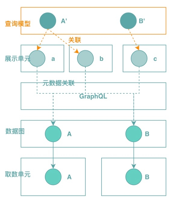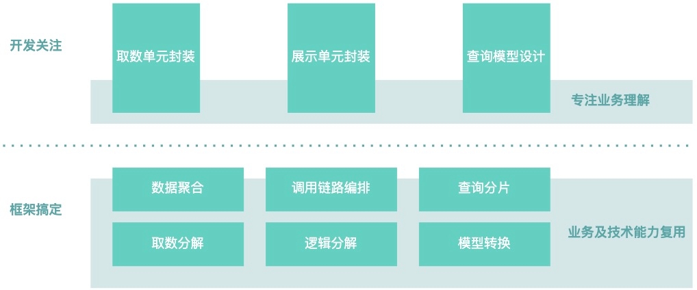 新架构提供了一套基于业务抽象出的标准化代码分解约束。以前开发同学对系统的理解很可能就是“查一查服务,把数据粘在一起”,而现在,研发同学对于业务的理解及代码分解思路将会是一致的。比如展示单元代表的是展示逻辑,取数单元代表的是取数逻辑。同时,很多冗杂且容易出错的逻辑已经被框架屏蔽掉了,研发同学能够有更多的精力聚焦于业务逻辑本身,比如:业务数据的理解和封装,展示逻辑的理解和编写,以及查询模型的抽象和建设。如下示意图所示: