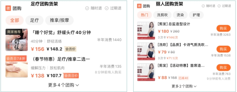 字段拼接逻辑差异:比如以上图中两个团购货架的团购标题为例,同样是标题,在丽人团购货架中的展示规则是:[类型] + 团购标题,而在足疗团购货架的展示规则是:团购标题。