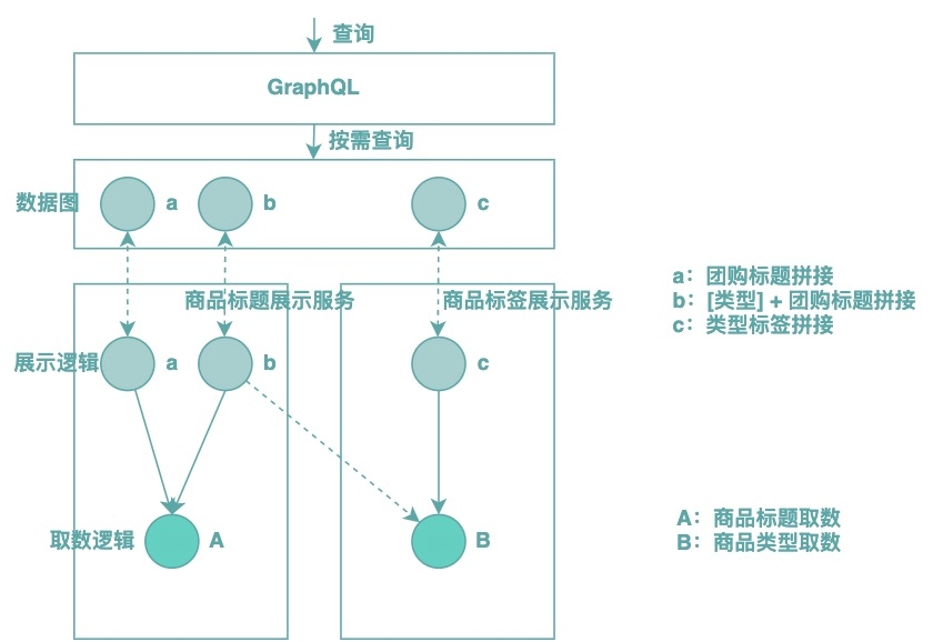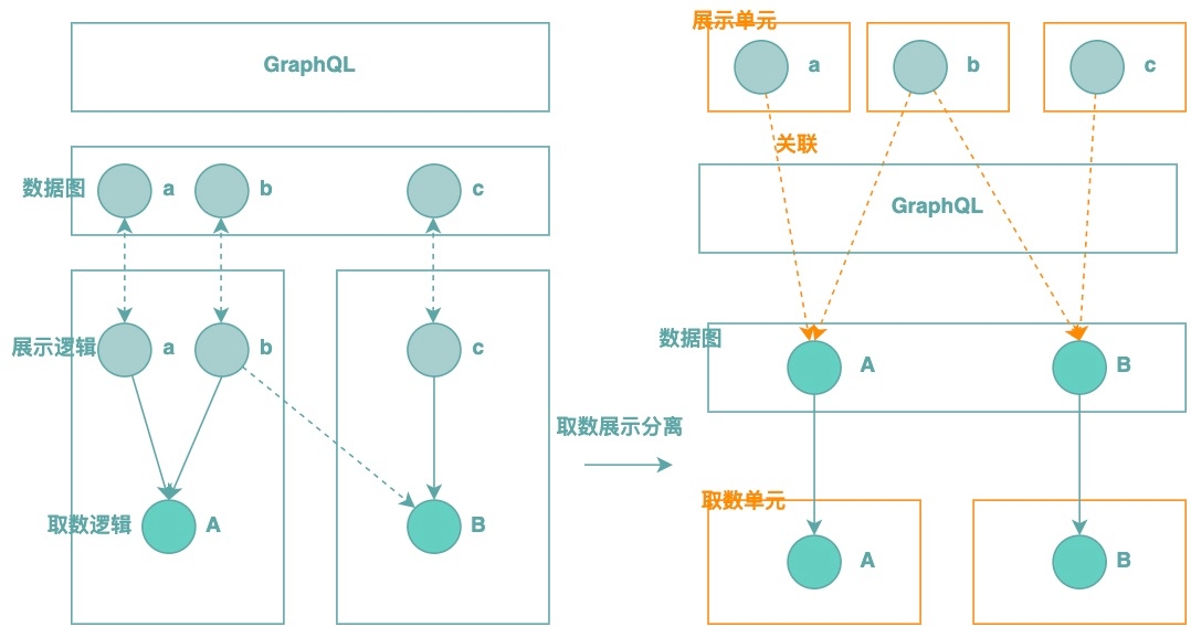 上文提到,在商品展示场景中,展示逻辑和取数逻辑是多对多的关系,而传统的基于GraphQL的后端BFF实践方案把它们封装在一起,这是导致展示服务颗粒度难以设计的根本原因。思考一下取数逻辑和展示逻辑的关注点是什么?**取数逻辑关注怎么查询和聚合数据,而展示逻辑关注怎么加工生成需要的展示字段,它们的关注点不一样,放在一起也会增加展示服务的复杂性。**因此,我们的思路是将取数逻辑和展示逻辑分离开来,单独封装成逻辑单元,分别叫取数单元和展示单元。在取数展示分离之后,GraphQL也随之下沉,用于实现数据的按需聚合,如下图所示: